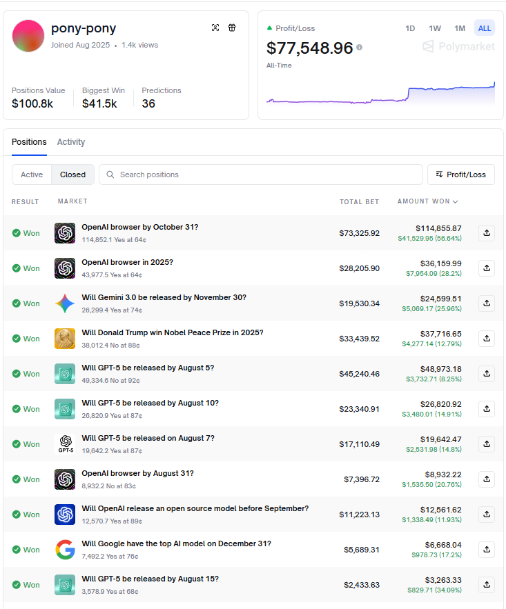 Polymarket user “pony-pony” boasts a 100% win rate with over $77,000 in realized profit by betting on events related to the artificial intelligence development company, OpenAI, prediction market data aggregator Polymarket Money said in a Monday X post.