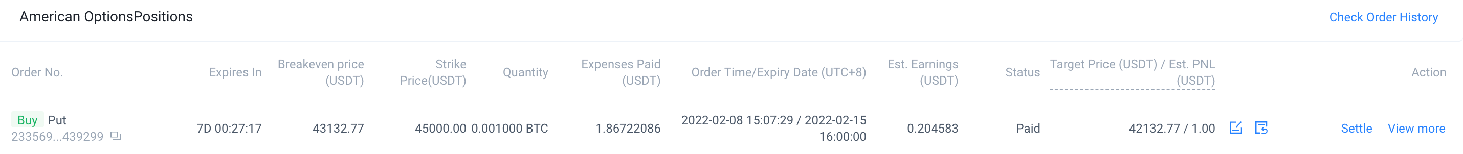 Auf der Registerkarte "Offene Position" wird der geschätzte Gewinn dieser Position 0,20 USDT betragen, d.h. wenn Alexa sich entscheidet, die Option jetzt auszuüben, indem sie auf "Abrechnen" klickt, wird sie 0,20 USDT mit dieser Position verdienen. Da sie 1,87 USDT für den Kauf der Option ausgegeben hat, würde ihre GuV 0,20 - 1,87 = -1,67 USDT betragen.