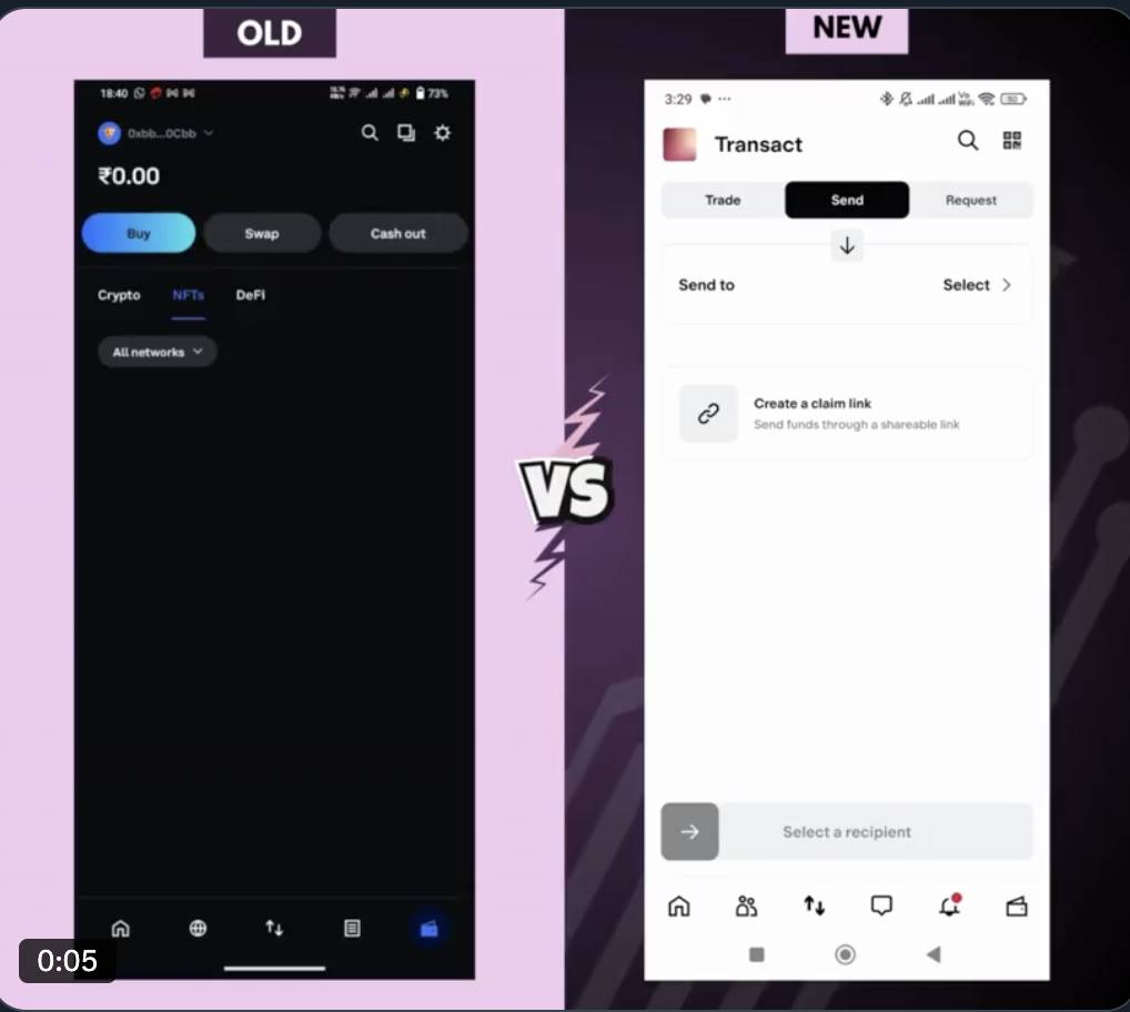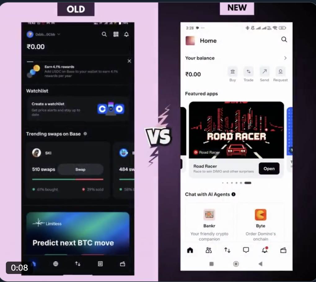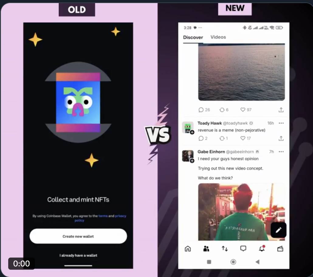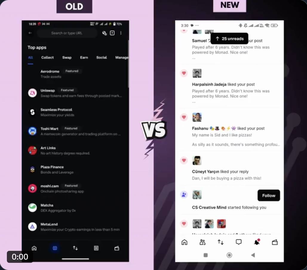 旧版钱包没有任何社交发现功能,而新版通过 Farcaster 数据,让你可以浏览动态,还可以切换到视频模式。