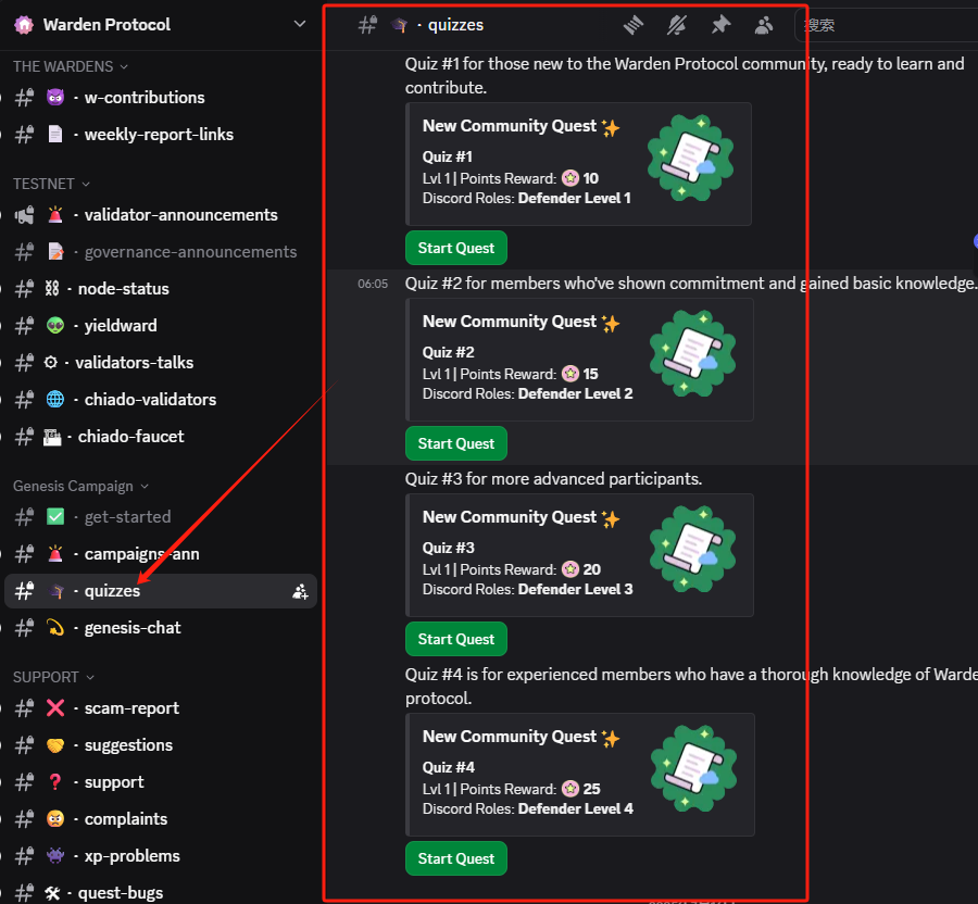 2️⃣ 进入 #quizzes 频道,上滑找到 4 个 Start Quest,依次点击答题
