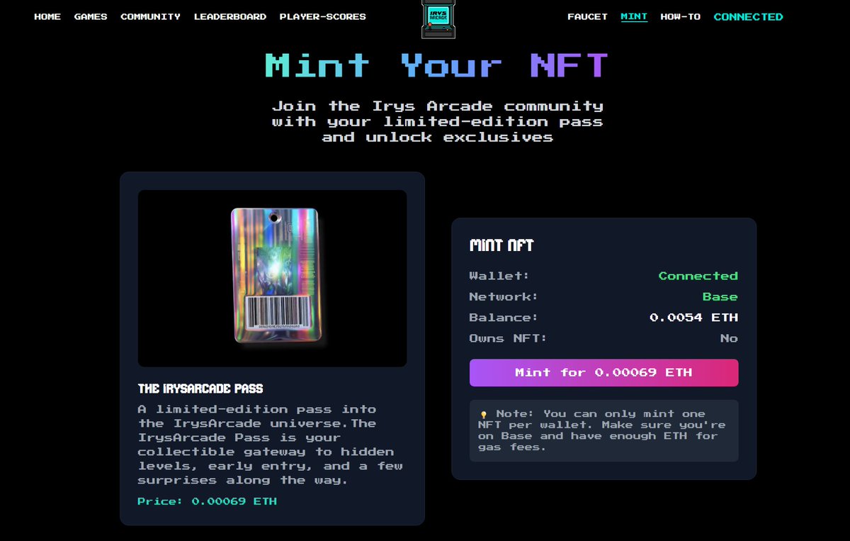 Irys Arcade @IrysArcade 发布了一个lris Arcade通行证,Base链收费0.0054 ETH,每个钱包只能铸造一个NFT,打不打看自己哈lrysArcade通行证是你的收藏品,能带你进入隐藏关卡,抢先体验新内容,一路上还有各种惊喜等着你。另外有4款游戏可以参与体验领水: