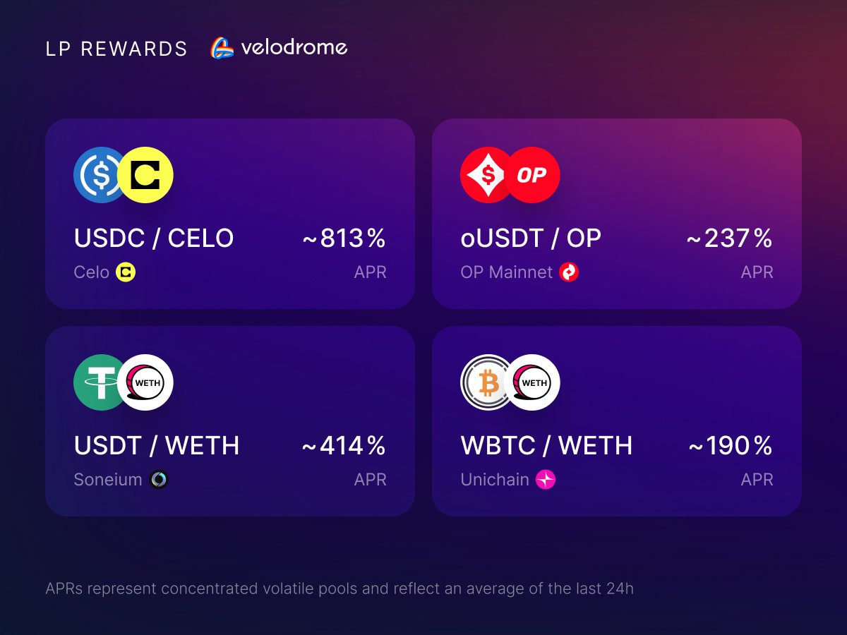 Velodrome Slipstream LP 奖励 🚴♂️• $USDC - $CELO: ~813%• $USDT - $WETH: ~414%• $oUSDT - $OP: ~237%• $WBTC - $WETH: ~190%在 Velodrome 的流动性页面上探索所有 LP 机会