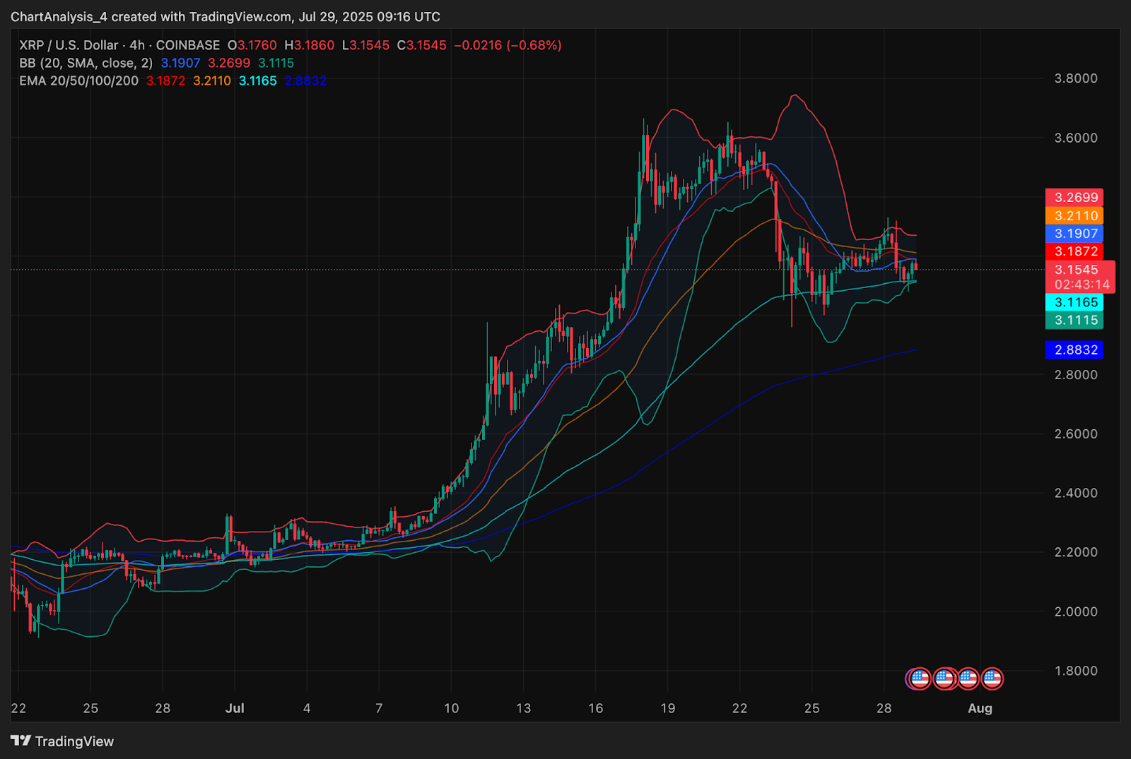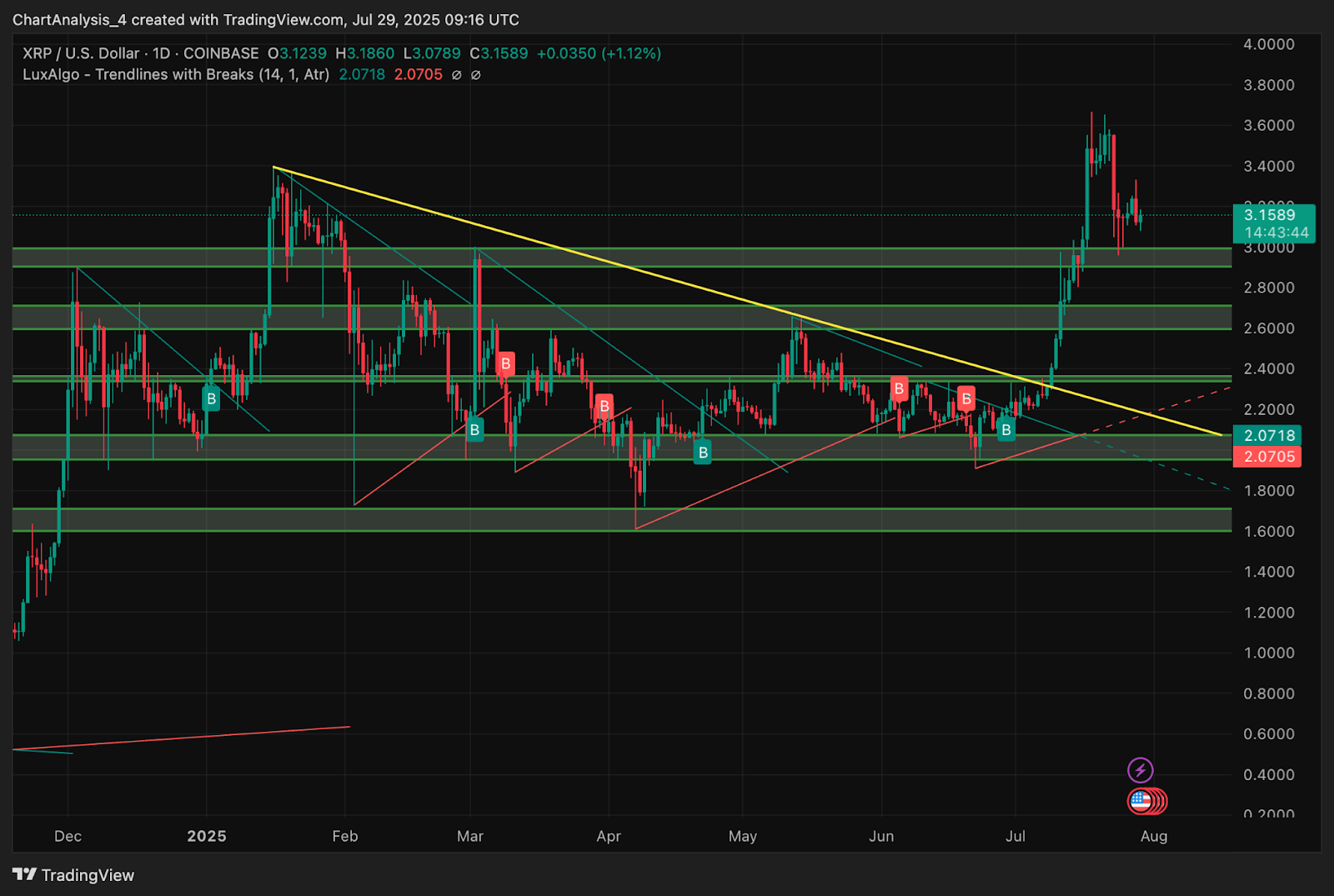 В начале июля XRP вырвался из долгосрочного нисходящего треугольника, спровоцировав резкий скачок, в результате которого стоимость токена выросла с $2,20 до $3,60 менее чем за две недели. С тех пор цена откатилась и сейчас тестирует зону спроса $3,10–$3,15. На дневном графике структура остаётся бычьей: XRP удерживается выше предыдущих уровней сопротивления в районе $2,80 и $3,00.