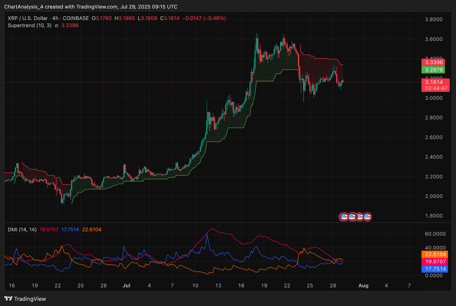 Сегодняшнее падение цены XRP связано со стечением ряда сигналов отката и ослаблением импульса. На 4-часовом графике цена неоднократно отбивает сопротивление супертренда $3,33–$3,34. Полосы Боллинджера сузились около текущих уровней, указывая на подавленную волатильность после резкого июльского скачка. Показания индекса направленного движения (DMI) также снизились: ADX опустился до значения 22,6, а линии +DI и -DI сблизились, что свидетельствует об ослаблении тренда.