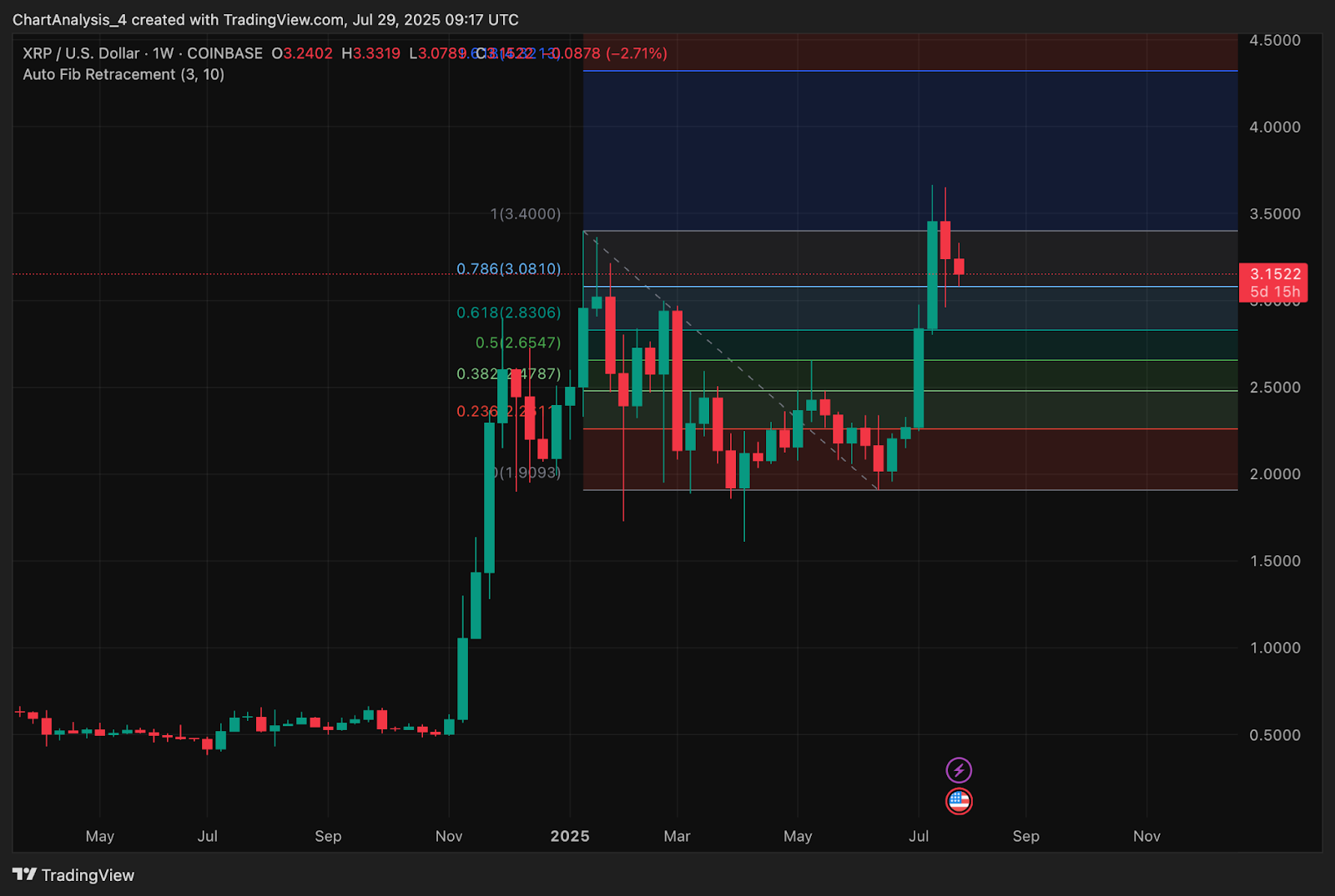 Уровни коррекции Фибоначчи на недельном графике устанавливают отметку $3,081 в качестве отметки 0,786, которая служит точкой опоры с 25 июля. Эта область теперь служит краткосрочным магнитом для ценовой динамики. Пока XRP остаётся выше этой линии, общий тренд остаётся неизменным.