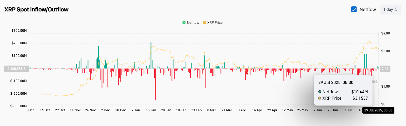 Несмотря на это снижение, данные по спотовому притоку относительно позитивны. Согласно последним данным о чистом потоке, 29 июля приток XRP на биржу составил +10,44 млн долларов США. Это указывает на некоторую тенденцию к покупкам на спаде или ротации, хотя пока недостаточно сильную, чтобы восстановить восходящий импульс.