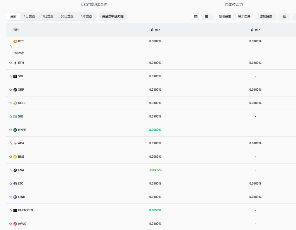 5、 当前火币主流币种USDT或USD及币本位合约资金费率数据如下: