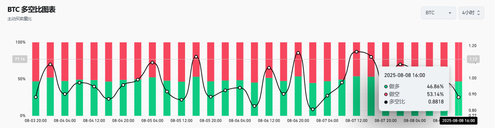 4、 过去4小时,BTC合约全网多空比为0.8818,空头占优势。