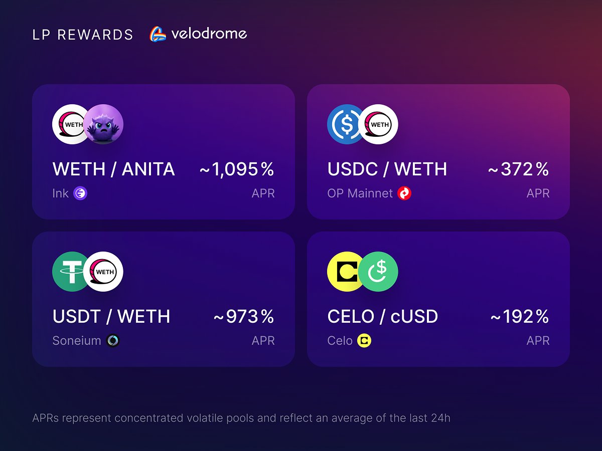 Velodrome Slipstream LP Награды 🚴♂️• $WETH - $ANITA: ~1,095%• $USDT - $WETH: ~973%• $USDC - $WETH: ~372%• $CELO - $cUSD: ~192%Исследуйте все LP возможности на странице ликвидности Velodrome