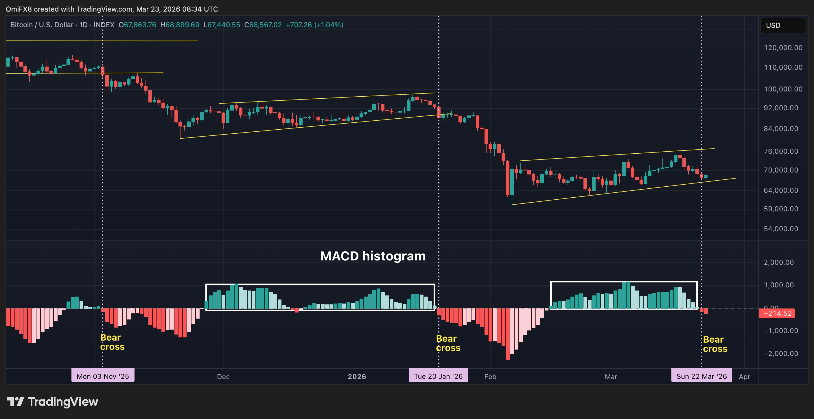 Bitcoin's daily chart with the MACD histogram. (TradingView)