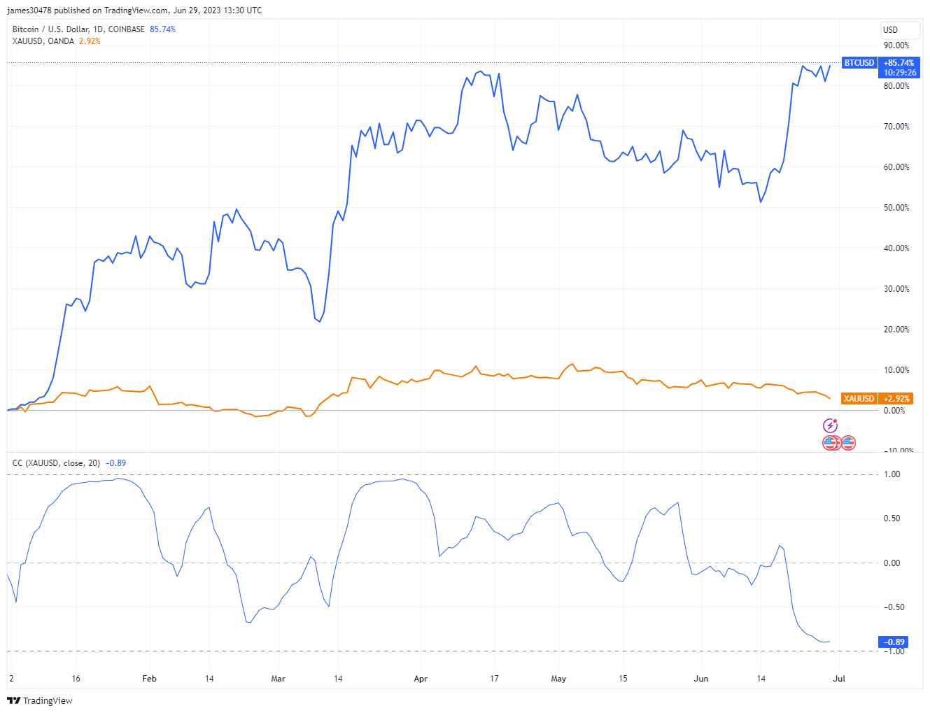 Bitcoin, however, is charting a different course, climbing higher and surpassing the $30,600 level. This divergence between the two often-compared asset classes has resulted in a significant drop in their correlation.