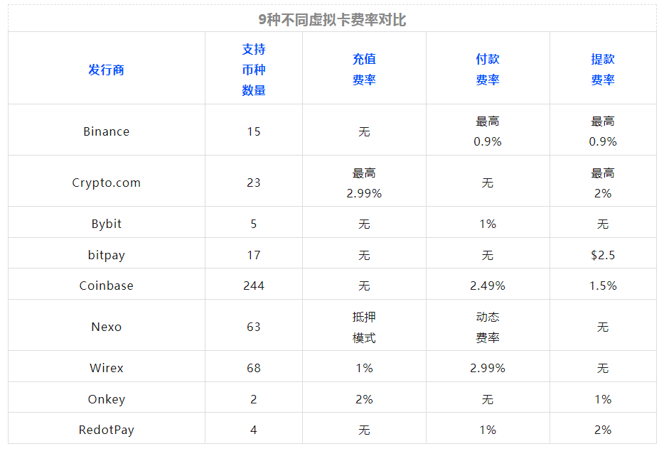 目前已有多家加密支付公司涉及加密貨幣虛擬卡領域。通常情況下,由加密貨幣交易所(如幣安)推出的加密貨幣虛擬信用卡,只需資金帳戶內有對應的資產即可在不同的消費場景採取刷卡、電子支付等方式進行消費、付款。交易所將在使用者執行付款、提款、兌換 & ATM 取現(如果支援的話)等操作時收取不同程度的手續費用。
