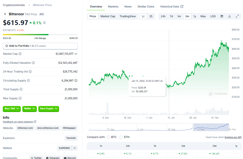 Bittensor项目代币 TAO 是本轮 AI 加密行情中最早启动的项目之一,TAO 代币价格从 1 月 15 日的 200 美元左右一路冲至 2 月 16 日的 700 美元,涨幅高达 3 倍多。