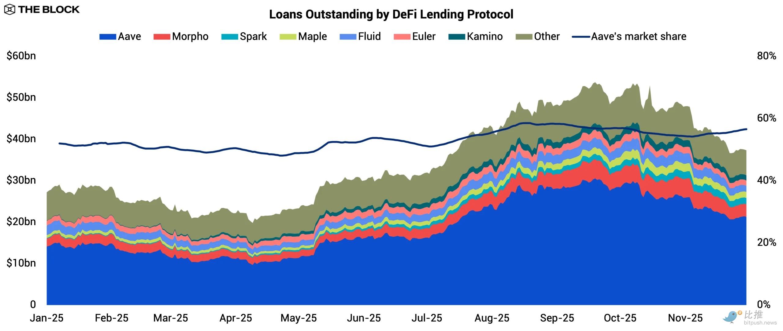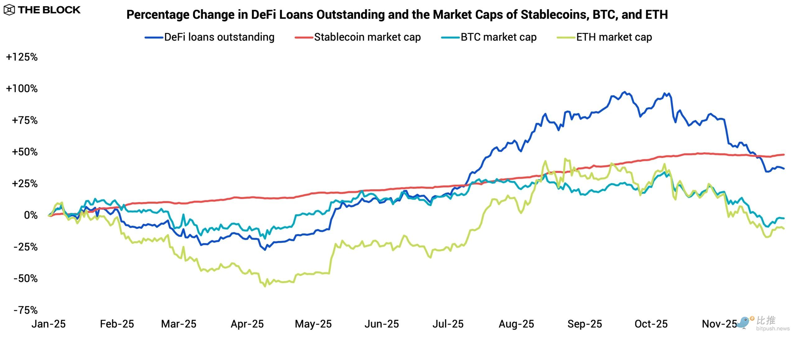 DeFi's credit engine continued to expand in 2025, albeit unevenly. The total outstanding loans across major lending protocols grew by 37.2% for the year, lagging behind the 48.1% growth rate of the stablecoin market capitalization.