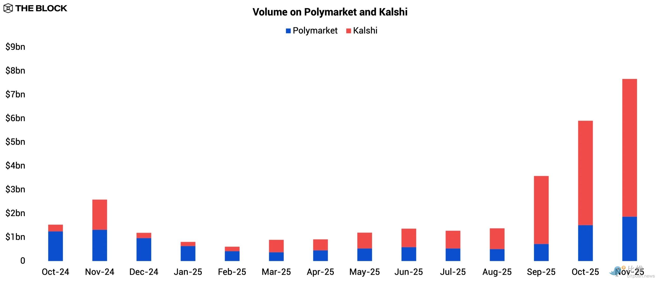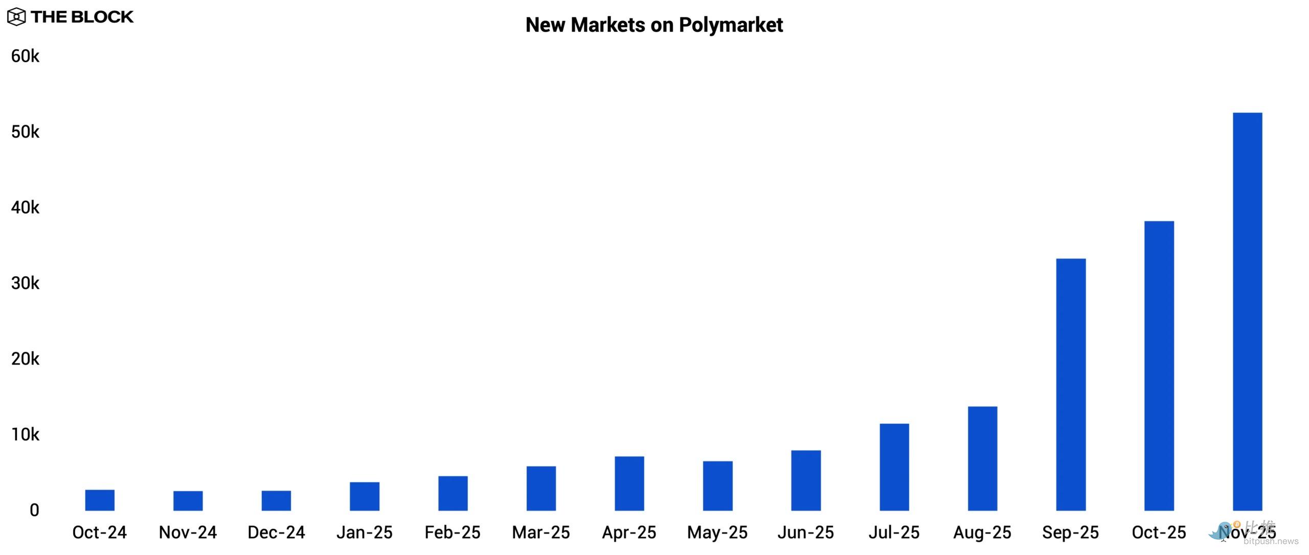 This competitive pressure seemed to prompt Polymarket to accelerate the creation of new markets starting in September to retain user engagement. Both platforms then hit records in November: Kalshi processed $5.8 billion, while Polymarket reached $1.9 billion.