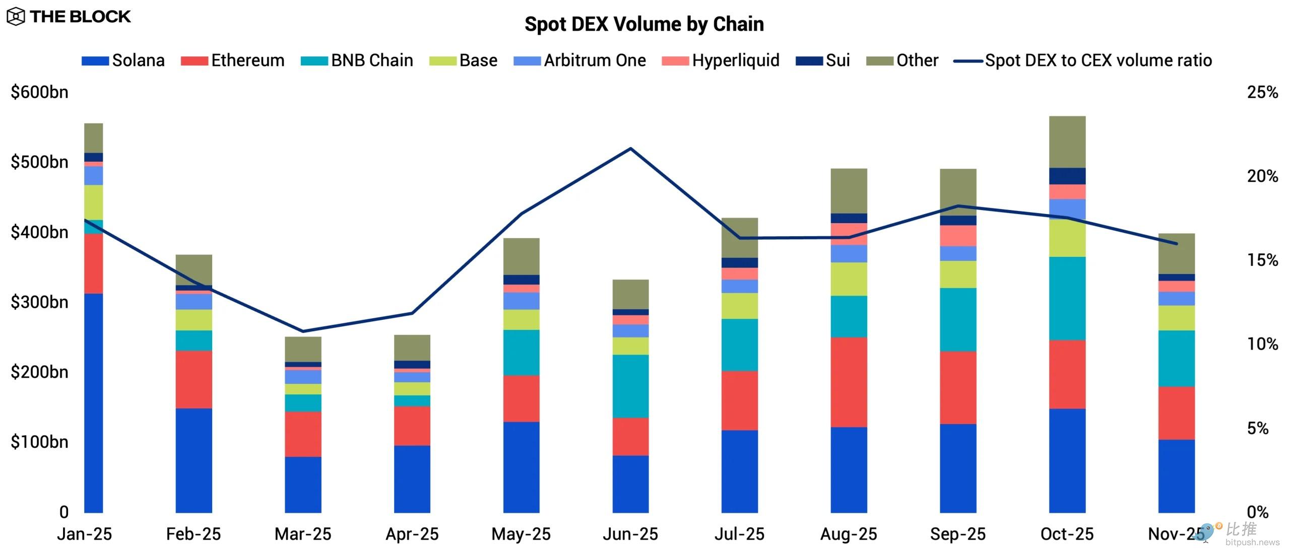 Spot DEX activity in 2025 lacked a clear upward trajectory. Volumes fluctuated throughout the year but ultimately failed to significantly outperform overall market growth. The most striking change came from chain-level rotation: Solana's monthly spot trading volume fell from $313 billion in January to $104 billion in November, a 66.7% drop marking the retreat of last year's retail-driven memecoin frenzy.