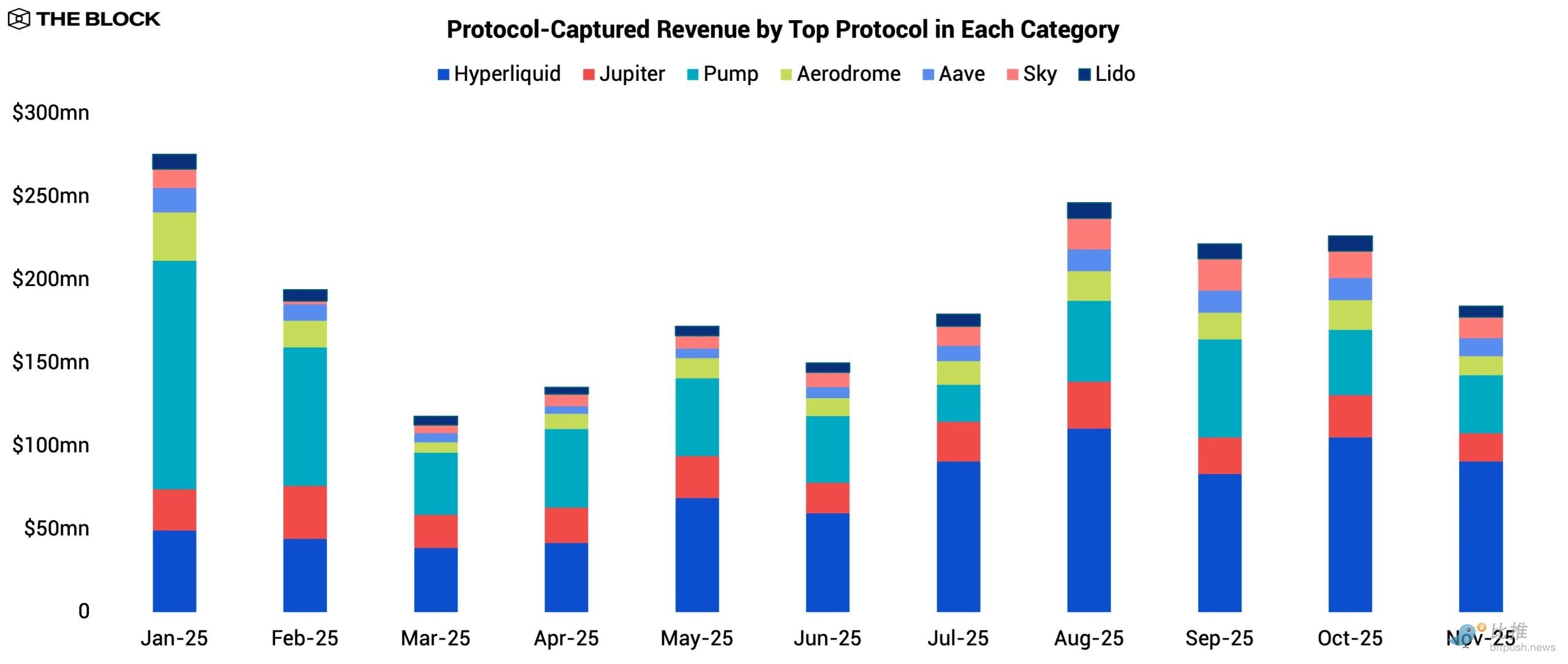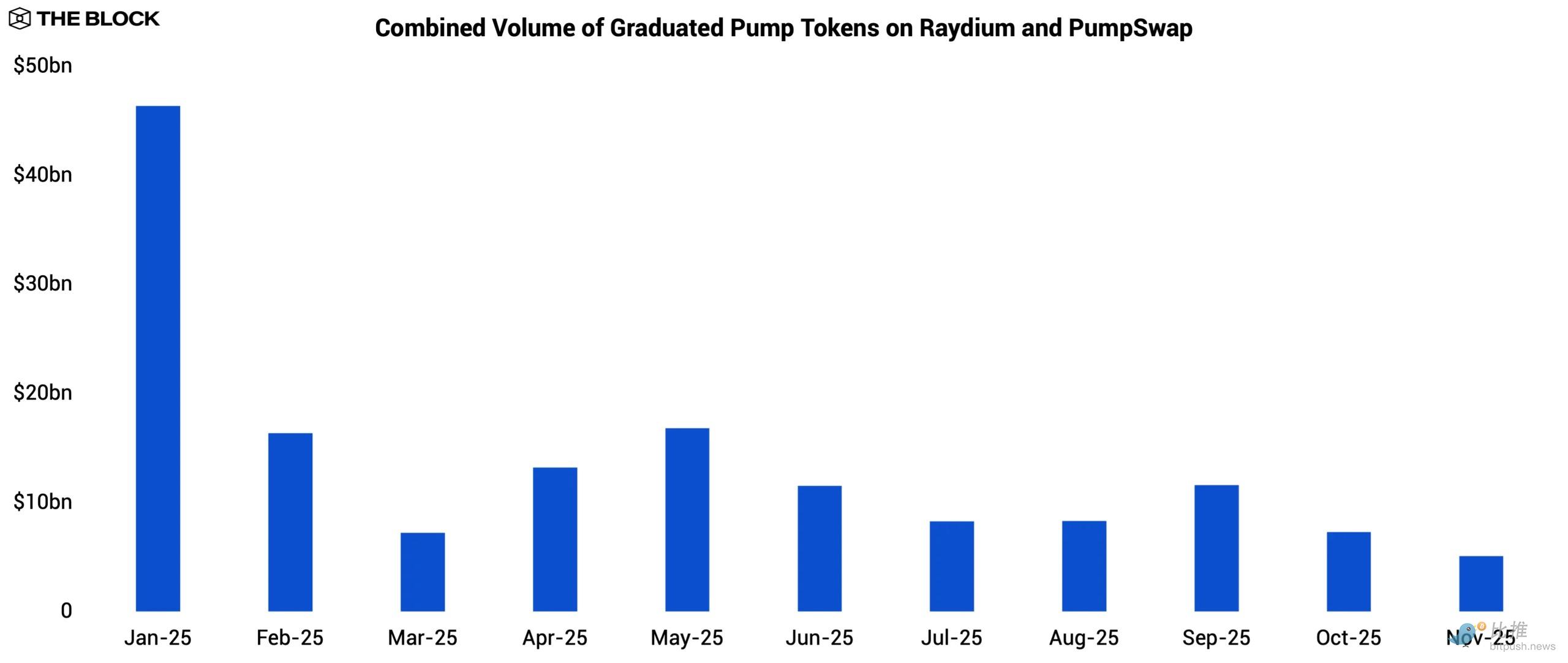 Pump.fun, the dominant token launchpad on Solana in 2024, saw trading volume for its "graduated" tokens on Raydium and PumpSwap plummet from $46.4 billion in January to $5.1 billion in November, an 89.0% decline. The collapse of retail investor enthusiasm for launchpad-incubated tokens meant the "frequent churn" cycle that drove Solana's spot DEX activity in 2024 failed to repeat on a similar scale in 2025.