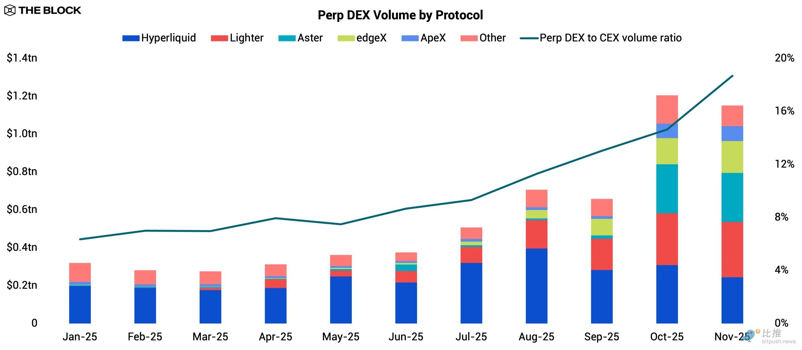 2025 was a milestone year for on-chain derivatives. The share of perpetual trading volume on DEXs vs. CEXs (Centralized Exchanges) tripled from 6.3% to 18.7%, marking a significant shift in a market long dominated by centralized venues. This trend reflects a narrowing efficiency gap, as perpetual DEX execution speeds, liquidity depth, and overall user experience have improved enough to accommodate more professional traders. October recorded the highest on-chain derivatives volume to date, driven by the market plunge on October 10th.