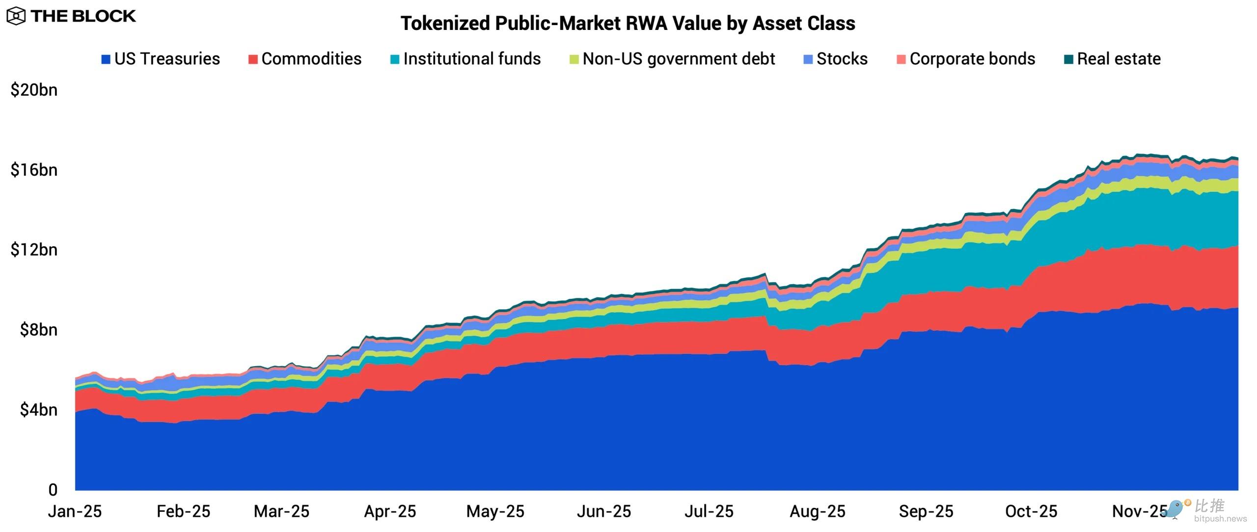 2025 was the breakout year for RWA tokenization. Stalled after the post-2022 liquidity crunch, the RWA market regained momentum. The value of tokenized public market RWAs grew from $5.6 billion to $16.7 billion, marking the sector's strongest expansion since its inception. This growth wasn't confined to a single asset class, with US Treasuries, commodities, and institutional funds all seeing significant inflows driven by different demand catalysts.