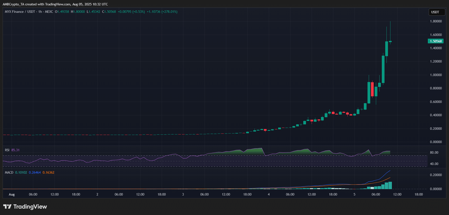 从短期走势看,MYX 小时图呈现显著上升趋势:K 线实体持续扩大,成交量同步攀升,涨势未见放缓迹象。技术指标方面,RSI(相对强弱指数)升至 85,处于极度超买区间;MACD 动能指标大幅上扬,显示多头力量依然强劲。8 月 4 日,MYX 更在币安平台领涨,成为当日表现最佳的代币之一,这一热度可能进一步催生市场的 “害怕错过”(FOMO)情绪。