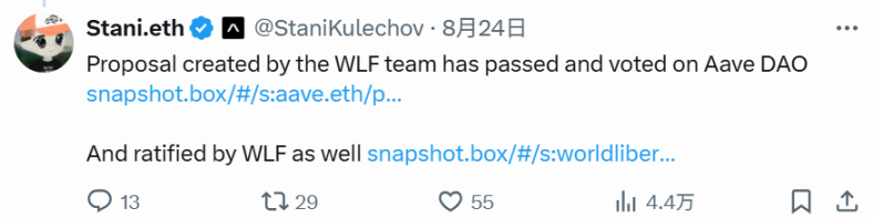 Aave 创始人 Stani.eth 在其推文下方回应表示,WLFI 团队创建的提案已在 Aave DAO 上投票并通过,得到了 WLFI 的批准,并附上了提案链接。