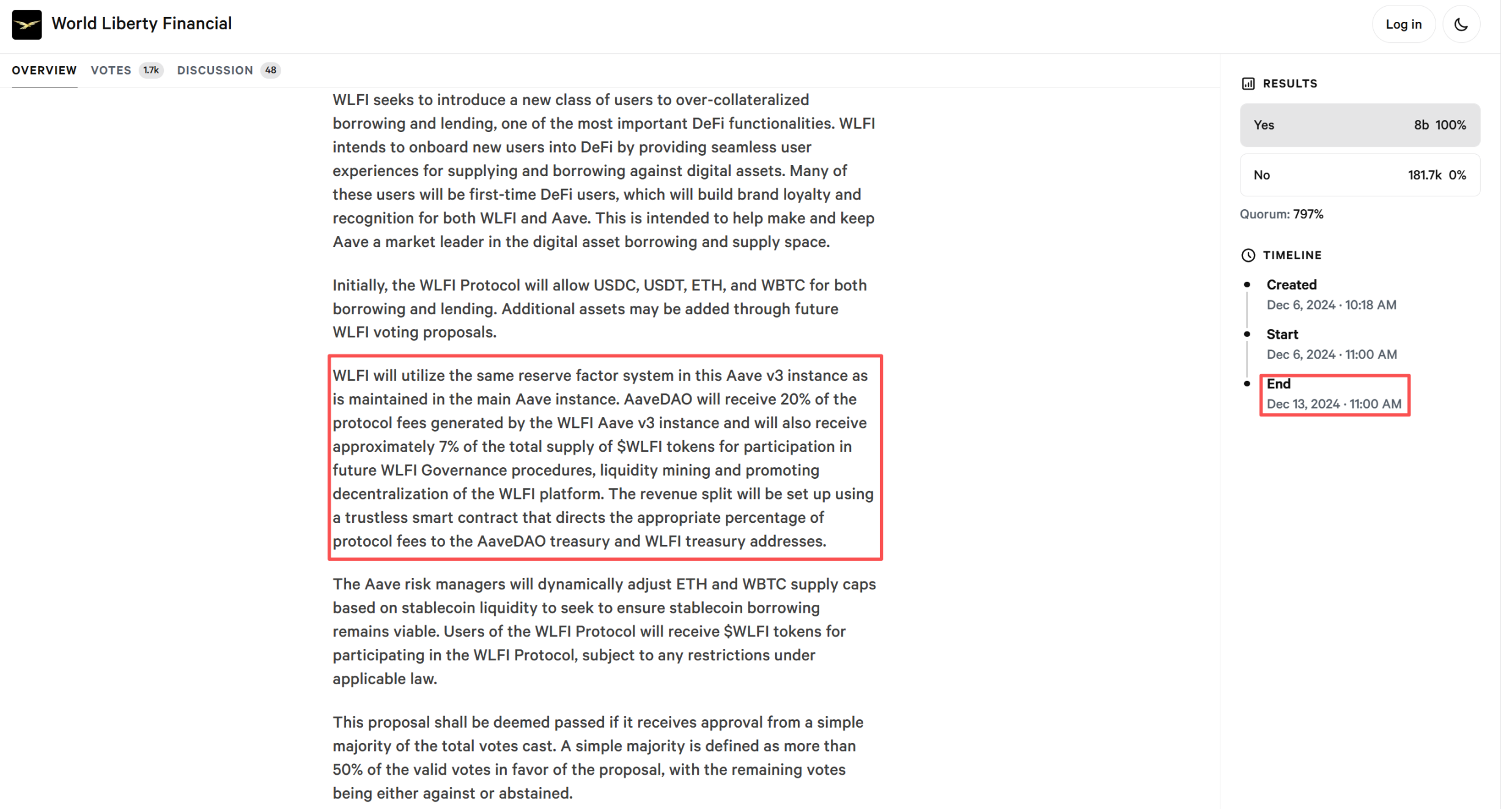 此前,Aave DAO(去中心化自治组织)通过一项提案:WLFI 将在 Aave V3 上部署其平台。作为回报,Aave DAO 将获得 WLFI 协议产生的 20% 费用分成,并分配约 7% 的 WLFI 总供应量(即 70 亿枚代币)。