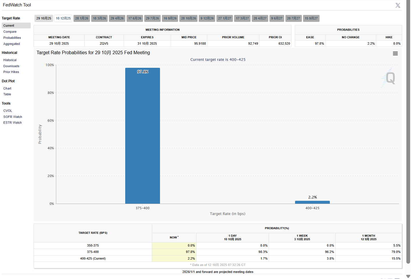 根据 CME「美联储观察」数据,美联储 10 月降息 25 个基点的概率高达 97.8%,12 月累计降息 50 个基点的概率达到 96.7%。这种流动性宽松预期为风险资产提供了有利环境。