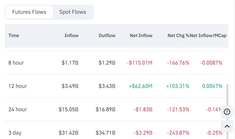 On the Futures side, traders have aggressively closed their positions, most likely to reduce exposure and avoid liquidations. According to CoinGlass data, over $16.89 billion flowed out of the Futures market compared to $15 billion in inflows.