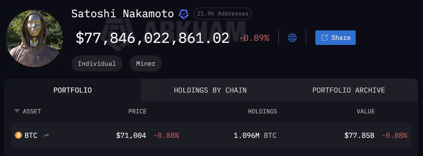 The anonymous identity has added a mysterious aura to Satoshi Nakamoto that persists to this day, and the potential归属 (ownership) and movements of his approximately 1.1 million BTC (approx. $77 billion) holdings始终牵动着 (always affect) market nerves.