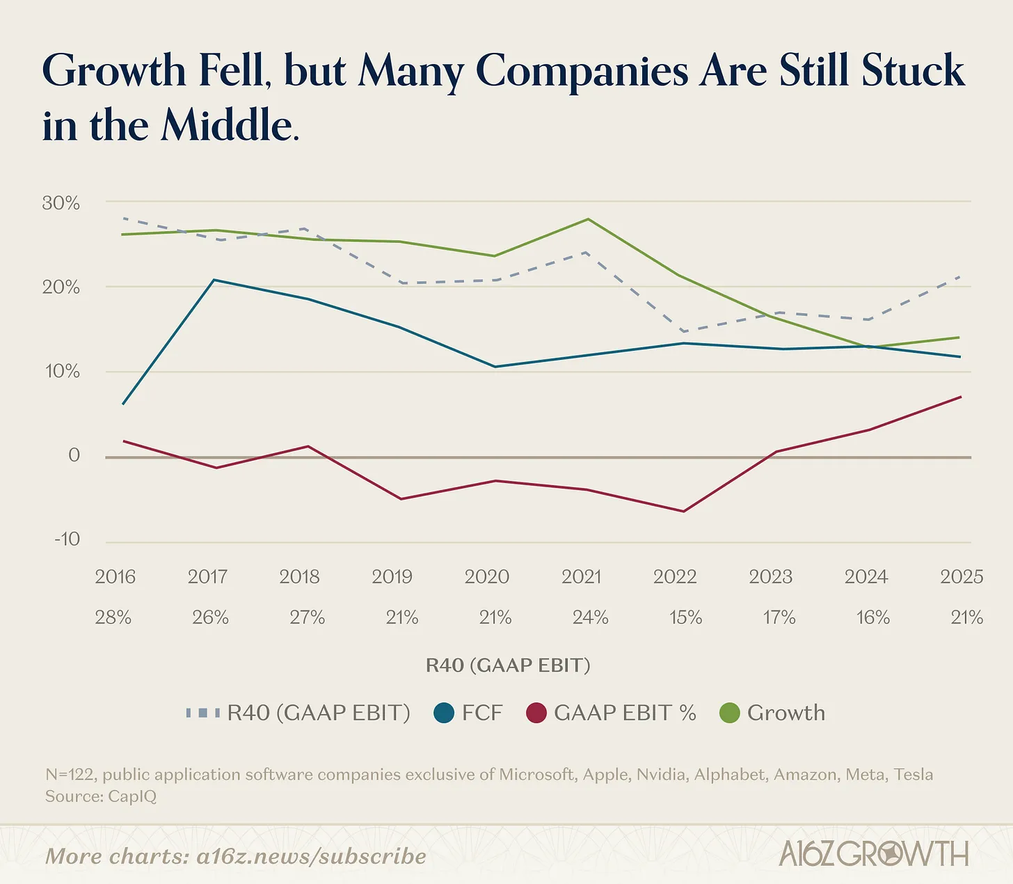 PANews Editor's Note: a16z partner David George published a new article stating that there is no more "middle ground" in the software industry. Companies must choose one of two paths within 12-18 months: achieve over 10% revenue growth through AI-native products or increase real profit margins to 40%-50%. He calls for companies to undergo thorough restructuring, clarify their development direction, and reshape their teams and architecture to adapt to the new AI-driven competitive environment. Otherwise, they will face valuation compression and market pressure.