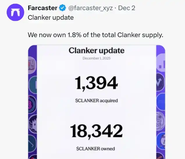 - Asset Issuance: By acquiring the token issuance platform Clanker,Farcaster has equipped its wallet-core strategy with asset issuance capabilities and now holds 1.8% of Clanker's total supply.