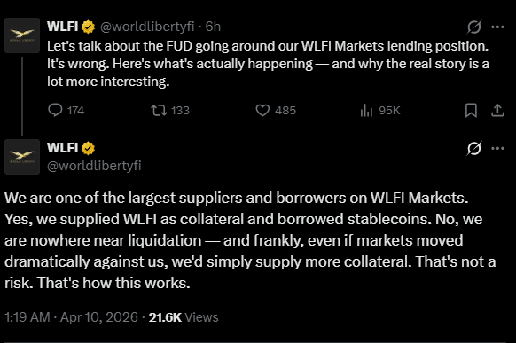 AWorld Liberty Financial dismissed the criticism as 'wrong FUD' and stated that their actions are 'not risk' but rather 'how this works.' They emphasized they are nowhere near liquidation and could supply more collateral if needed.