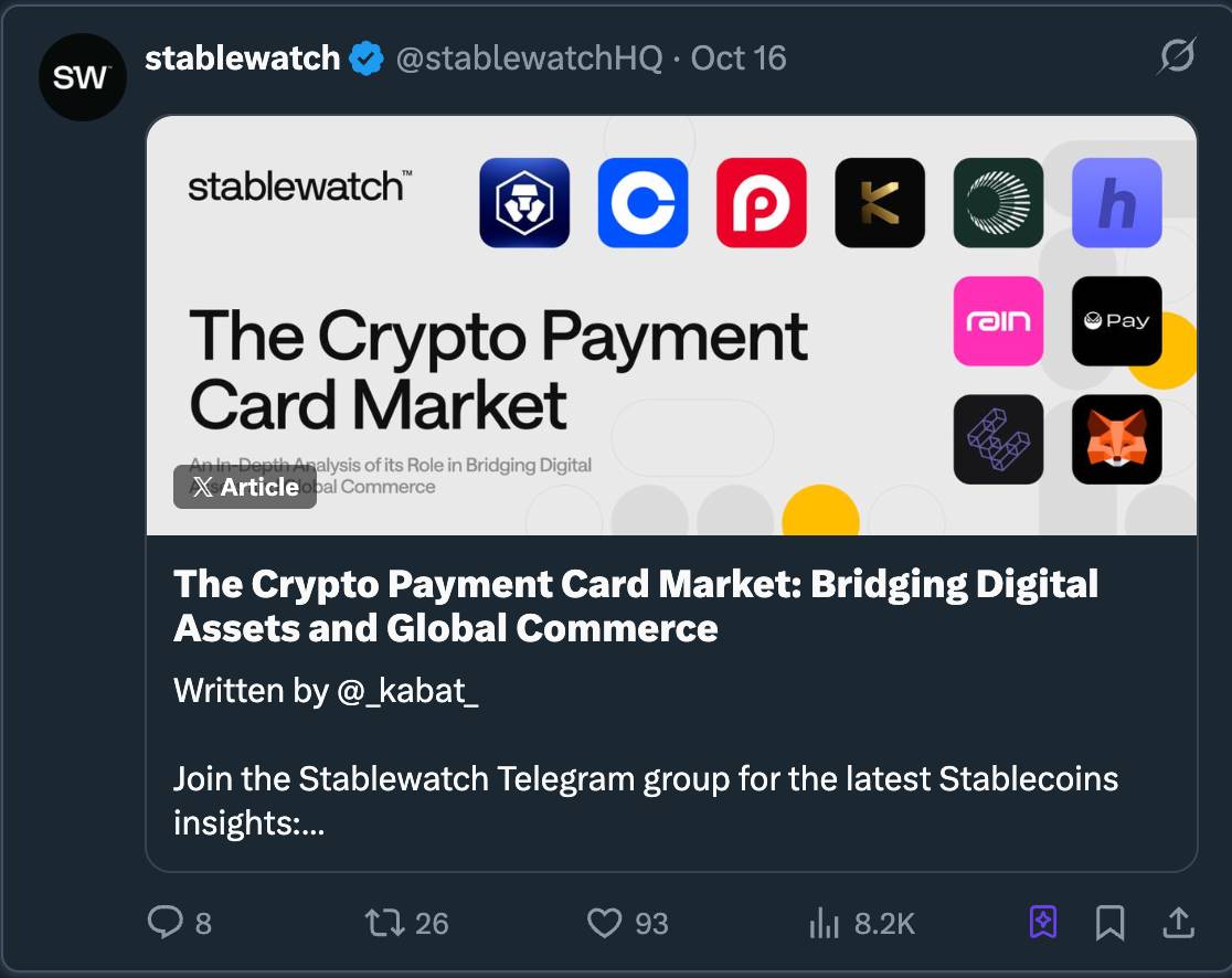 @stablewatchHQ conducted an in-depth analysis of this bridging mechanism, essentially defining it as a "Card-as-a-Service" (CaaS) model. This is a key point that many people最容易 overlook when discussing crypto cards. These CaaS platforms provide the infrastructure for issuing branded cards.极span>