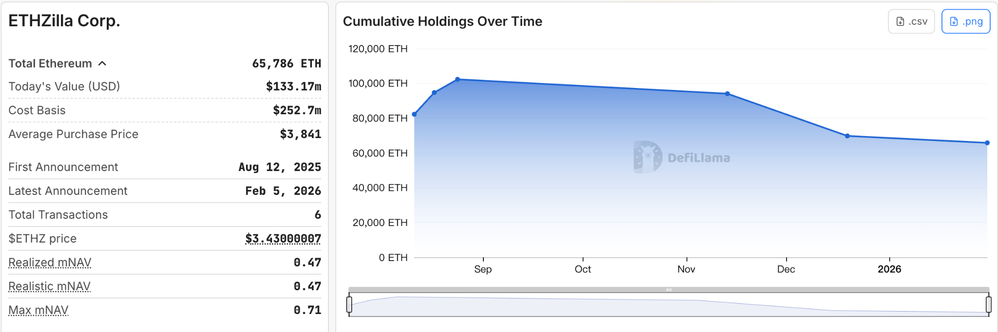 On November 13, 2025, ETHZilla began its first reduction of 8,293 ETH; on December 25, ETHZilla disclosed it had sold 24,291 ETH, generating proceeds of about $74.5 million. This transaction was part of redeeming outstanding senior secured convertible notes, making it the first sample of ETH treasury reduction. Currently, ETHZilla's ETH holdings are approximately 65,700 coins.