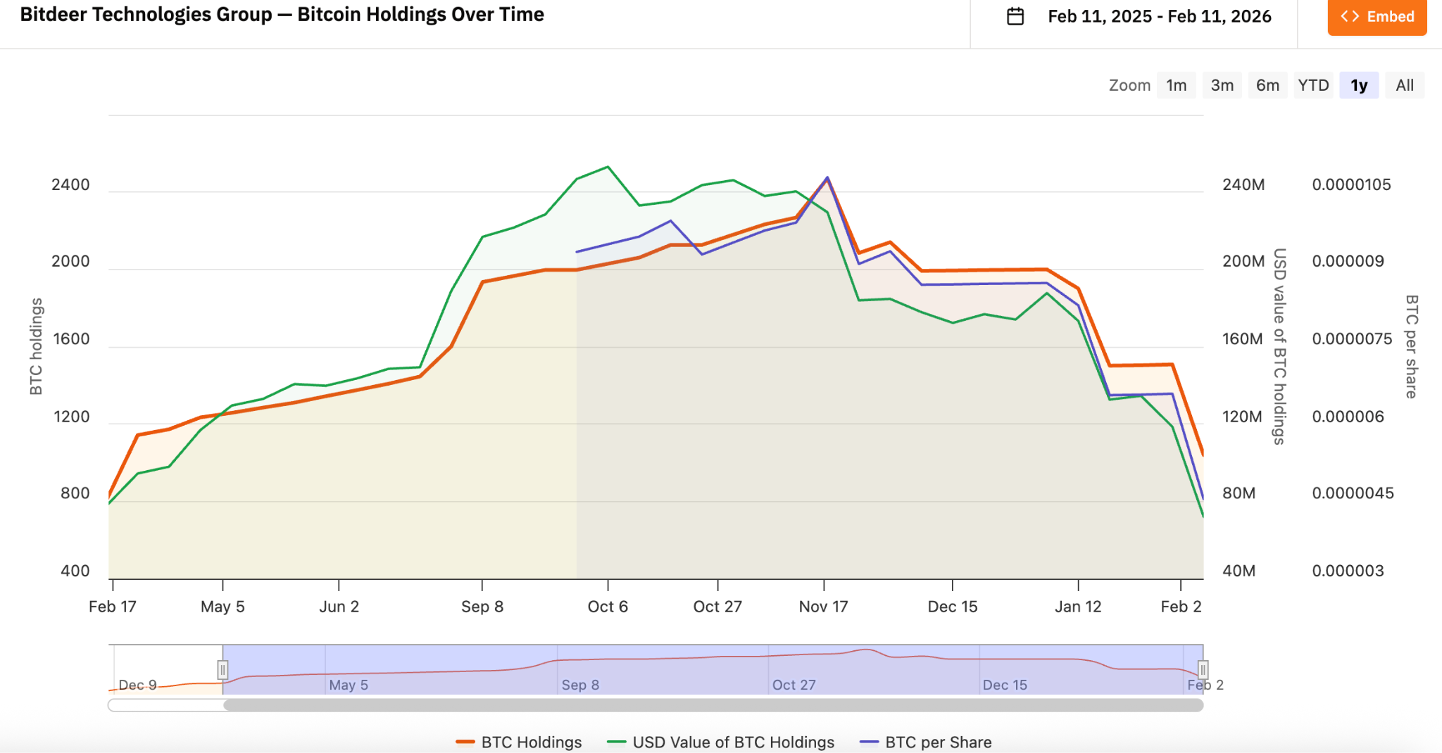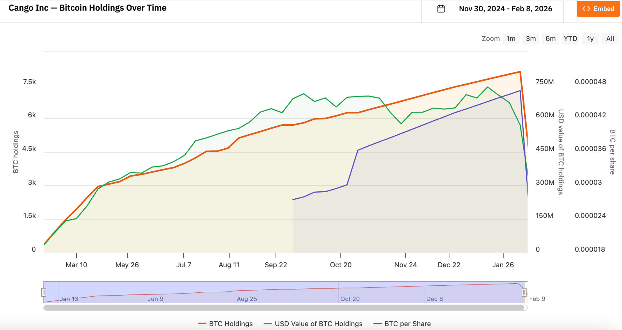 On February 9th, Cango disclosed that it had sold 4,451 bitcoins on the open market, with net proceeds of approximately $305 million, and used all the funds to repay a loan collateralized by BTC. This transaction size was close to half of its previous holdings, leaving only 3,645 BTC on its books after the sale.