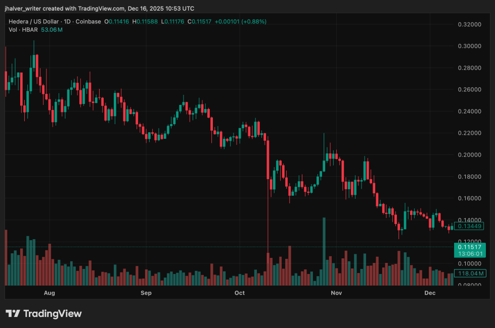 Hedera’s HBAR token is trading near its lowest levels in more than a year, reflecting both broader crypto market weakness and project-specific headwinds.