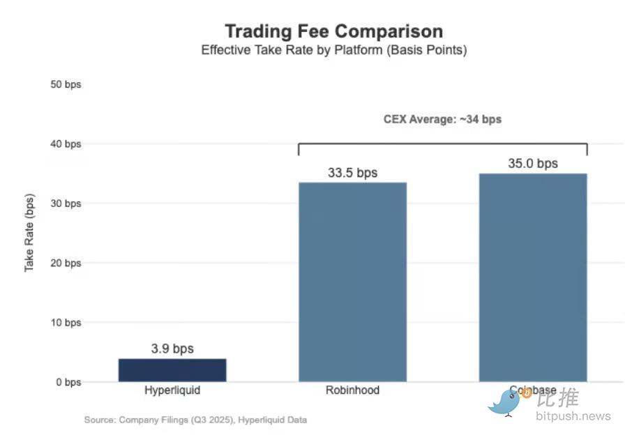 Hyperliquid's effective take rate of about 4 basis points aligns with its deep focus on the "market layer." It is building an on-chain Nasdaq simulator: an architecture with high throughput, margin management, and a clearing stack (HyperCore), employing maker/taker pricing and maker rebates, aimed at optimizing execution quality and shared liquidity, rather than单纯的 retail monetization.
