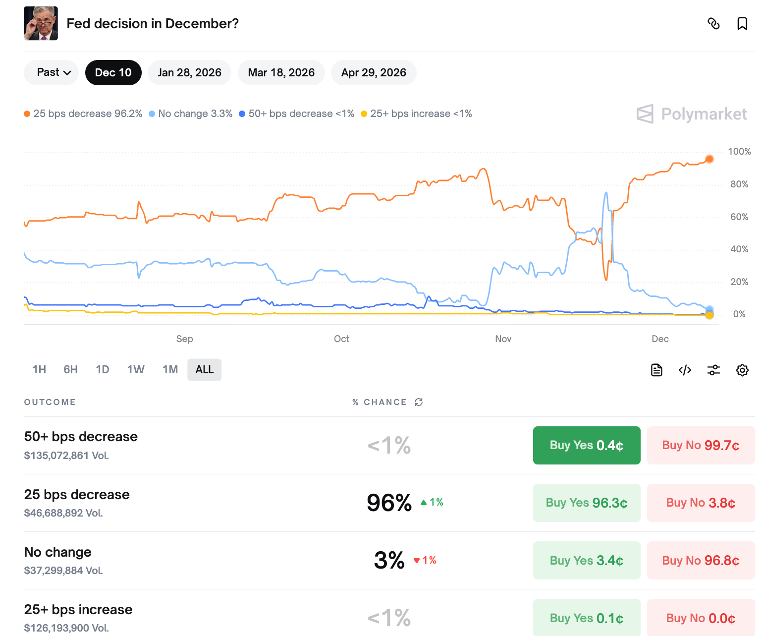 The odds of a 25 bps cut on Dec. 10 now stand at 96%, according to Polymarket