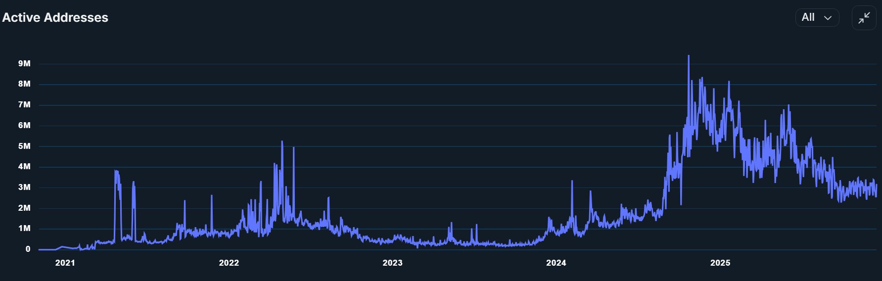 Solana’s daily active addresses peaked above 9 million on Oct. 22, 2024, during the height of memecoin trading. By December, daily users fluctuated between 2 million and 3 million. While that marked a sharp pullback from peak levels, activity remained consistently higher than before the boom.