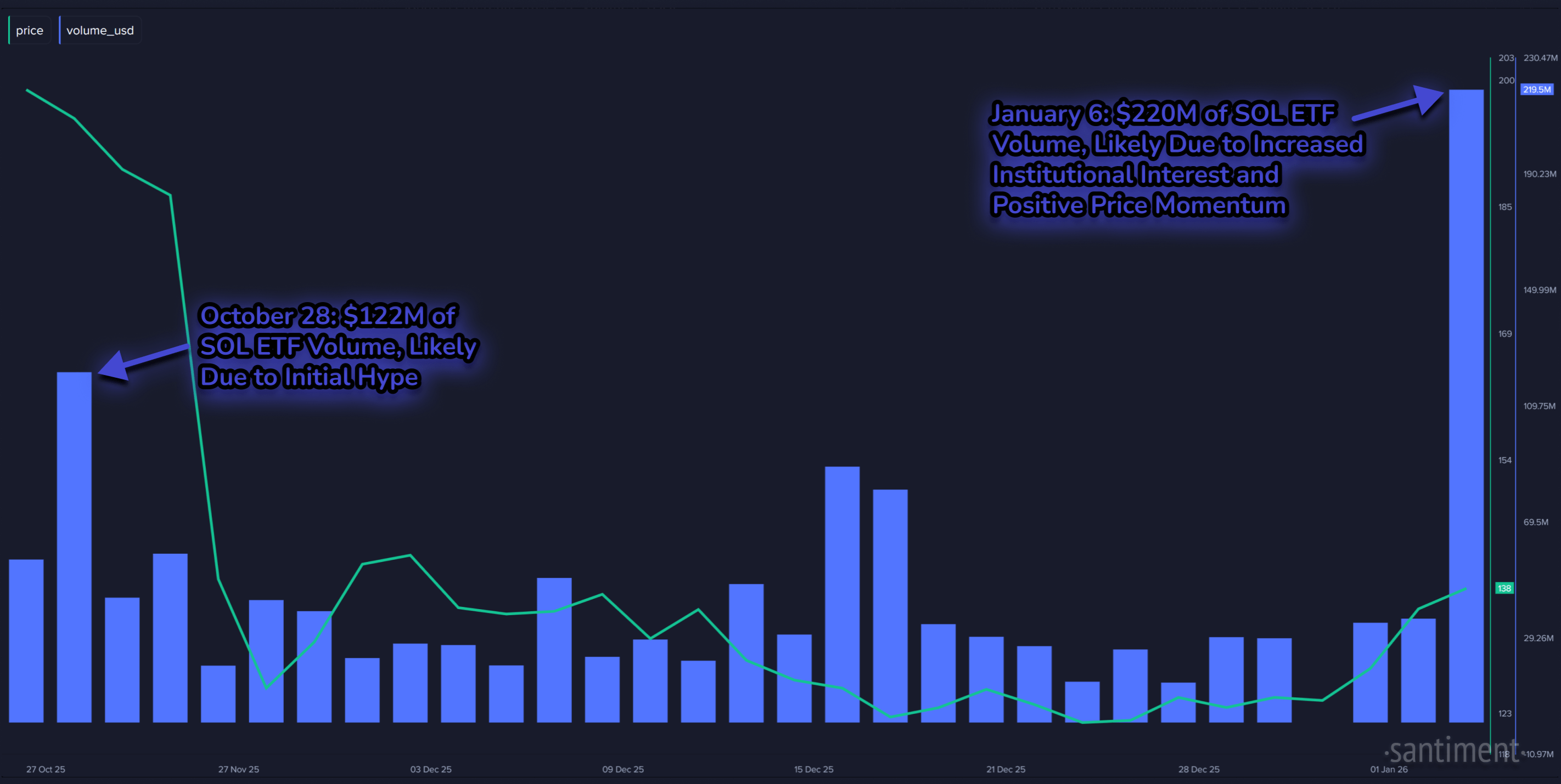 From the chart, it’s visible that SOL volume hit $220 million on January 6th, significantly higher than the October 28th spike. The uptick in the cryptocurrency’s investment vehicles has come as its price has enjoyed a rally, and Morgan Stanley has filed for its first Solana and Bitcoin ETFs.