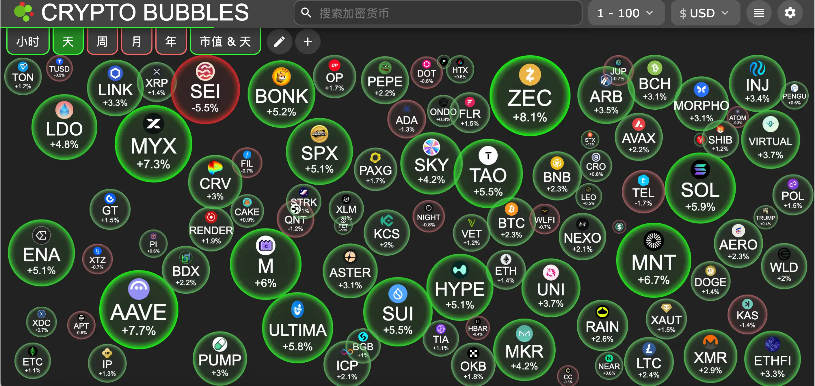 Today's top gainers among top 100 coins by market cap: Zcash up 8.1%, Aave up 7.7%, MYX Finance up 7.3%, Mantle up 6.7%, MemeCore up 6%.