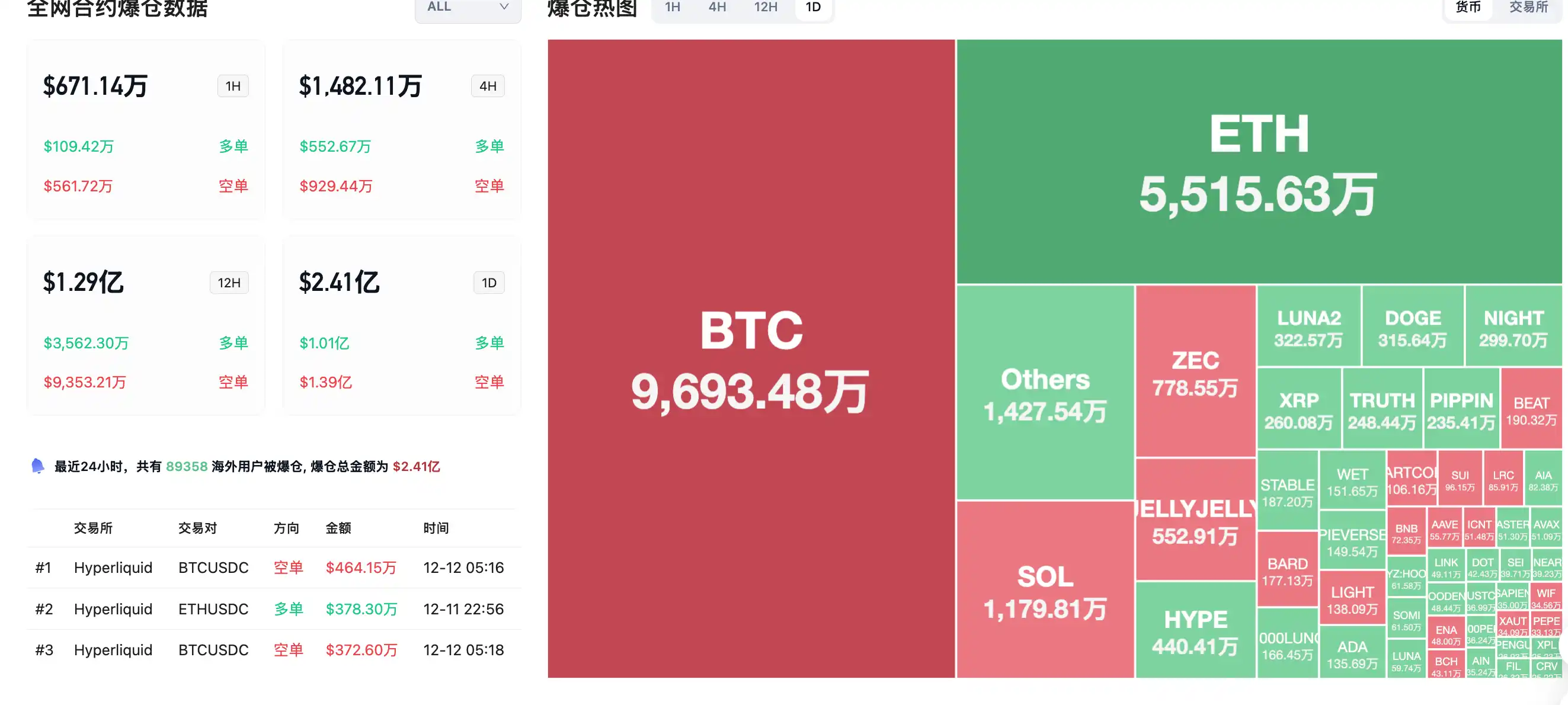 24-hour Liquidation Data: 89,358 people liquidated globally, total liquidation amount $241 million, including BTC liquidations $96.93 million, ETH liquidations $55.15 million, SOL liquidations $11.79 million