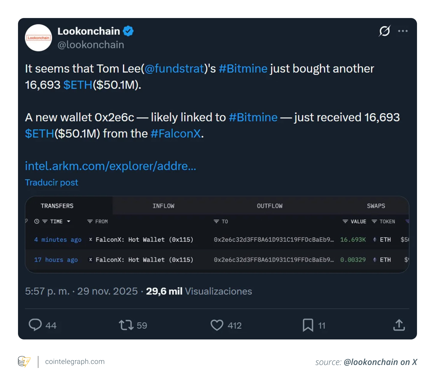 The company also reported buying 138,452 ETH over the prior week and said the treasury represents more than 3.2% of ETH’s supply.