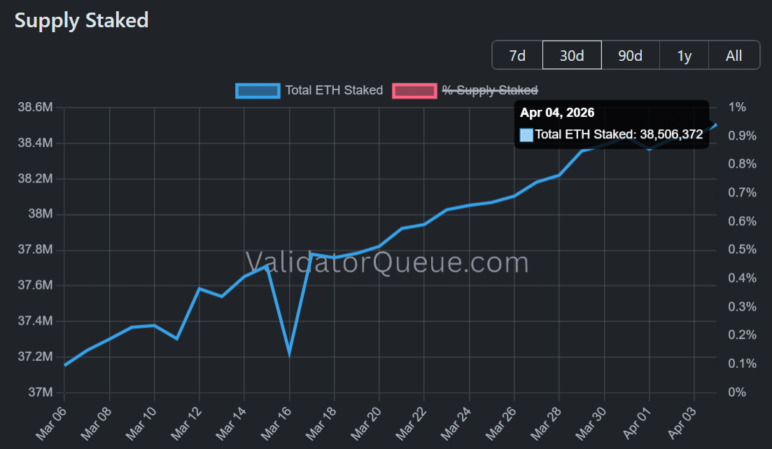 Data from Validator Queue shows Ethereum’s total staked supply reaching a new all-time high of 38.5 million ETH. That’s about 31.67% of circulating supply. Notably, despite March’s risk-off conditions, nearly 1.5 million ETH were added to staking during the month, reinforcing the ongoing supply-tightening narrative.