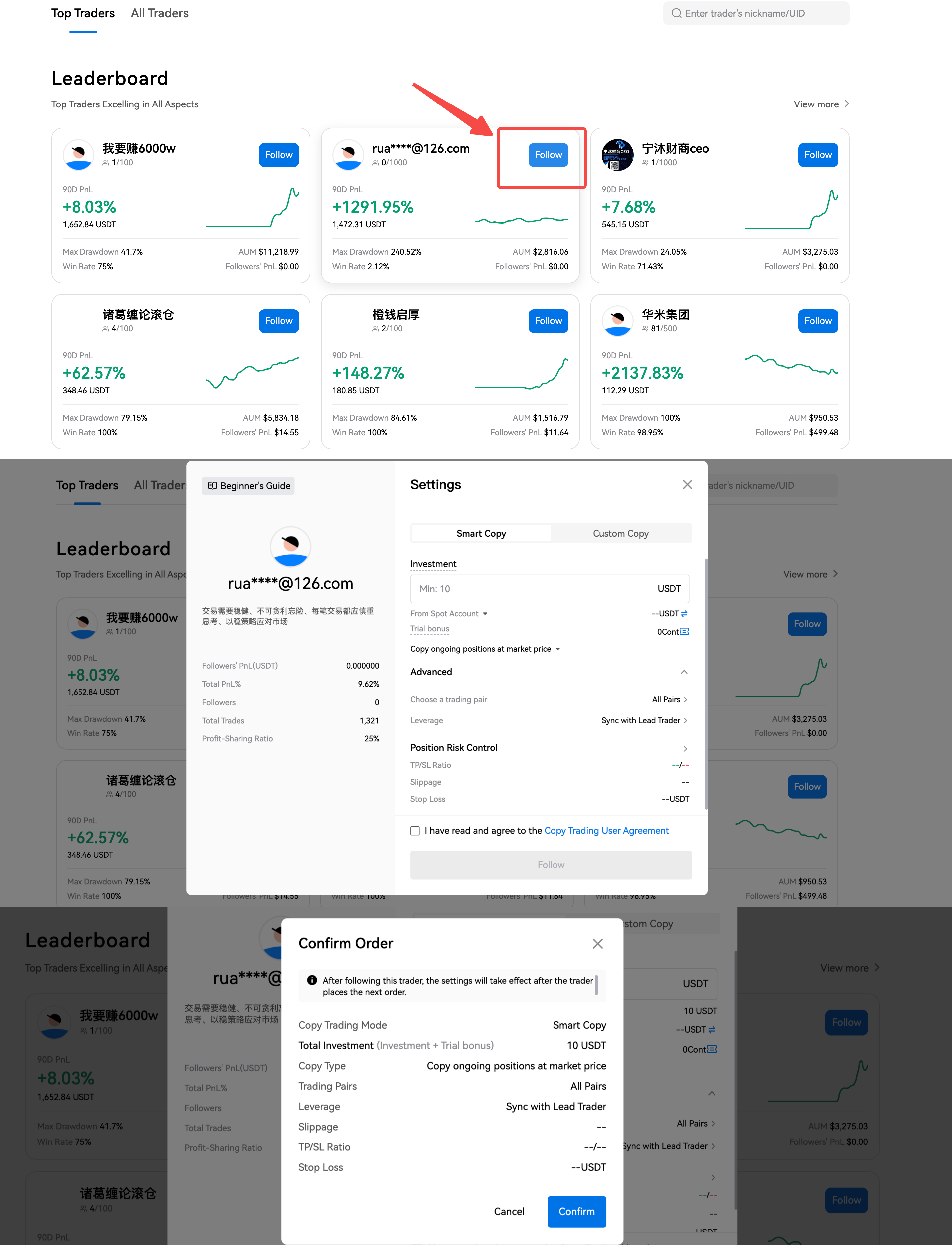 - On the Copy Trading homepage, select a trader you're interested in and click Follow. The system will then pop up the Copy Trading Settings window.