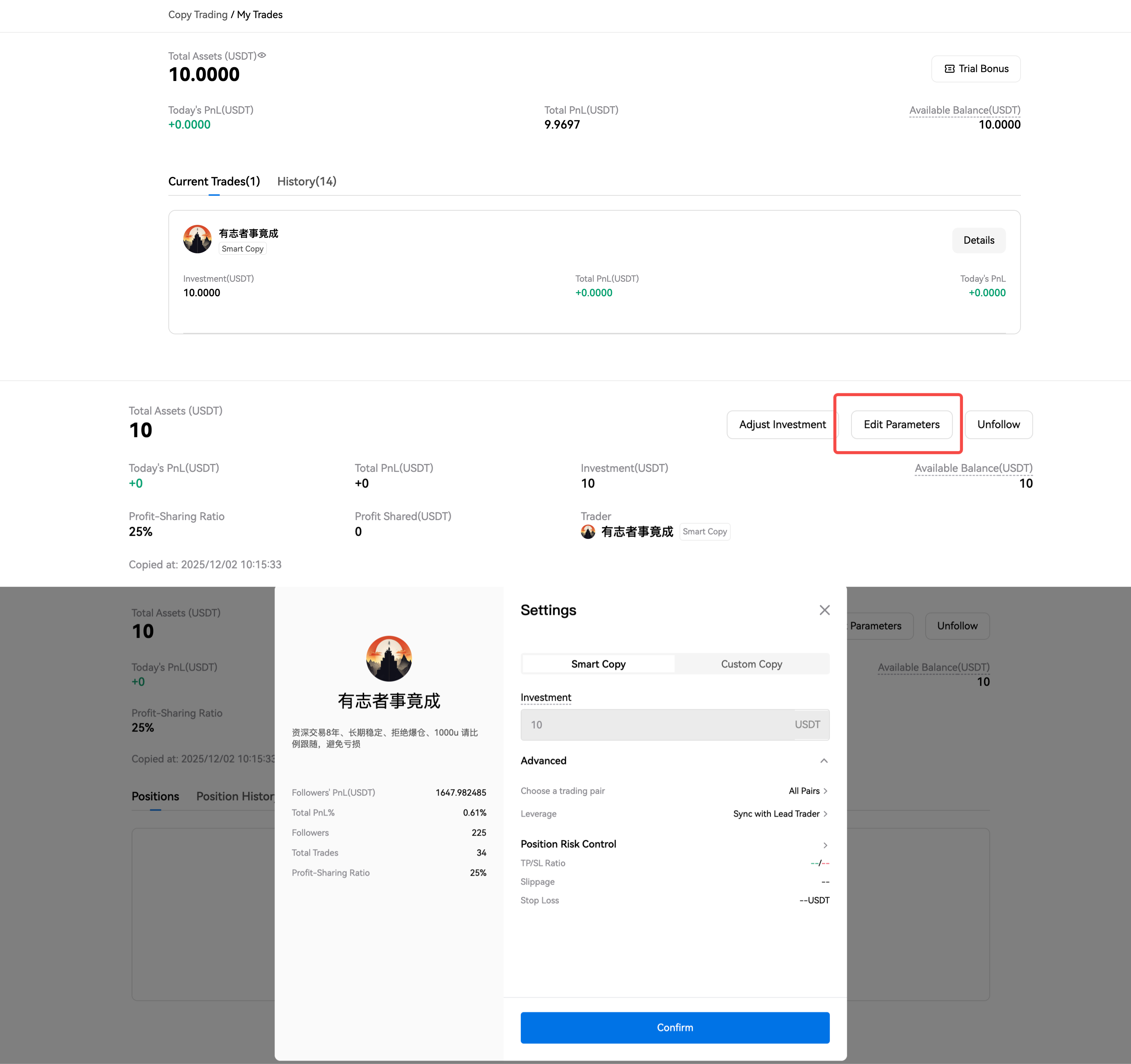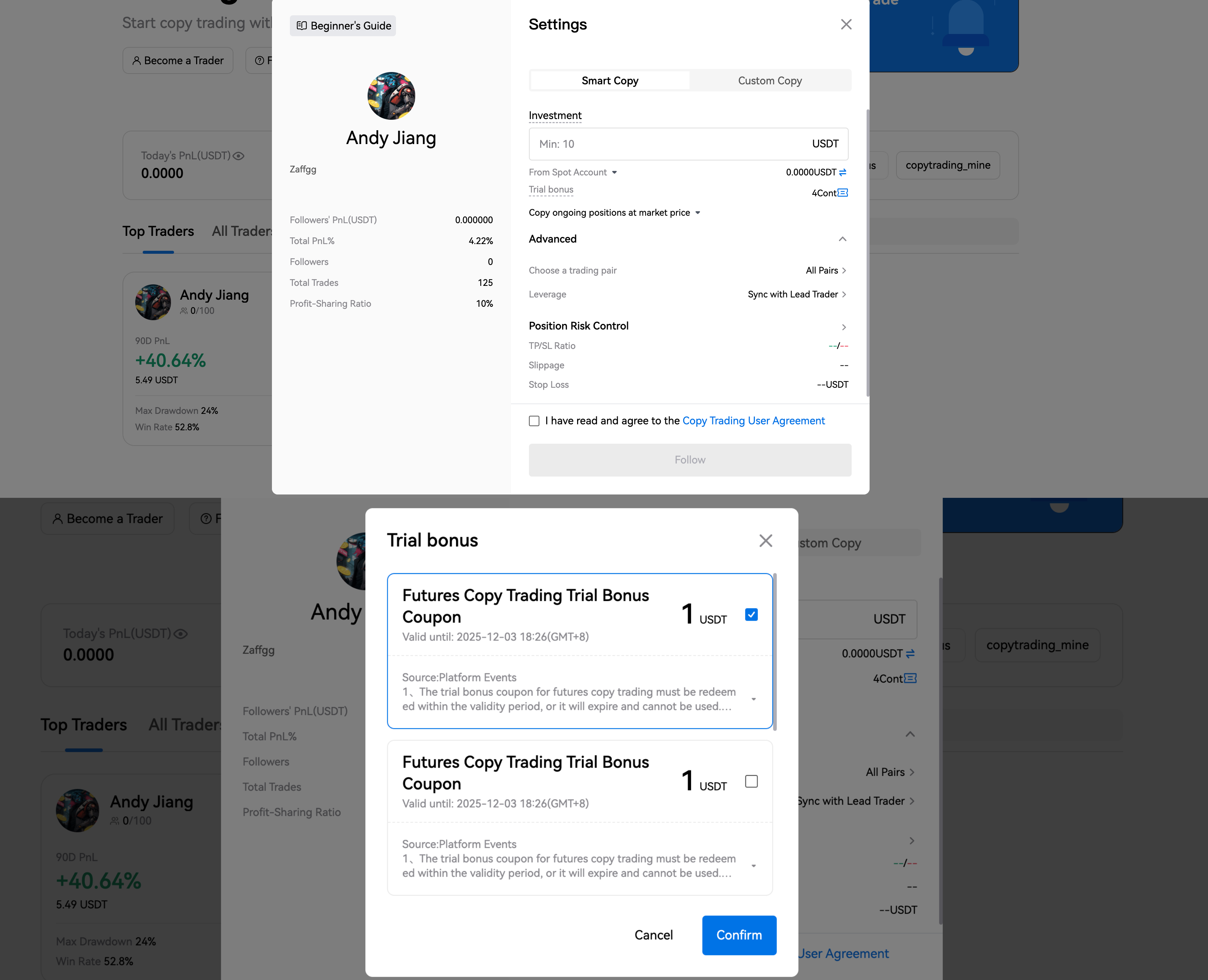 - Check the coupon and click Confirm to return to the Copy Trading Settings popup.