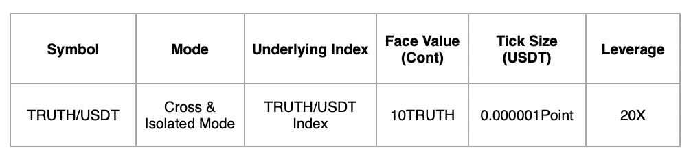 HTX has launched TRUTH/USDT perpetual futures, which supports 1-20x leverages for long and short trades.