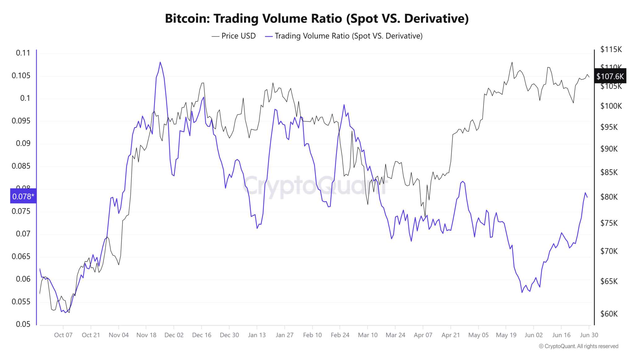 表面上看,市场似乎正摆脱宏观风险,但 CryptoQuant 提供的现货与衍生品交易量比率显示,局势可能没那么乐观。截至 5 月底,该比率降至 0.05,为大选前的最低水平,尽管此后略有反弹,但市场结构仍显脆弱。