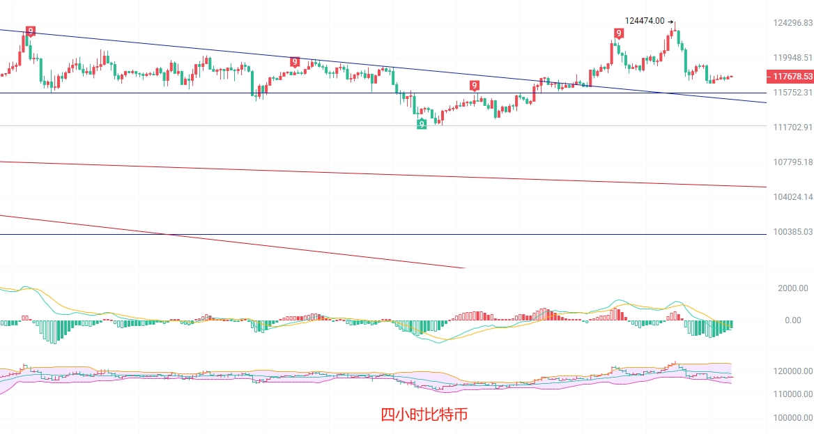 交易的根本是生存,其次才是收益,所以每次操作之前先想清楚自己的操作是否合理,本金是否安全,要形成一套属于自己的交易思路,不断优化完善,币圈院士的建议虽然不能让你一夜暴富,但是能做到一直有你,只有在币圈长期生存下去并且坚持到最后的人,才能得到自己想要的结果,希望你能听懂,别忘了,最黑暗的时刻往往是黎明前的时刻。在追逐梦想的路上,你永远不是孤单一人,你还有我我是币圈院士一个一直在保护韭菜的战士,祝愿我的粉丝们在2025年实现财务自由,一起加油!币圈院士:比特币(BTC)最新行情分析比特币现价117600,现在是北京时间凌晨一点半,行情又回到了昨天发稿的时候,加上周末,主力一波清算正在开香槟,咱们也算是跟着主力吃了一波,前面的行情就不说了,来看目前盘口,日K线目前在趋势指标内窄幅波动,受阻EMA30趋势支撑116800,重心还是空头趋势,关注关键支撑113750,守住了才会出现反弹守不住继续下探,四小时K线梯量下行,短线缩量向上移动受阻上方压力位118000,空头一直在增筹,多头乏力,做好防守,关注布林带中轨119200压力位,不破趋势依旧是空,