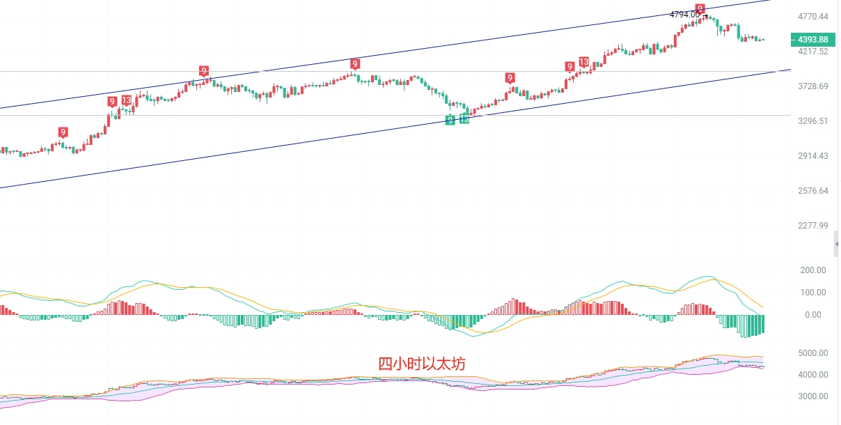 短线参考:小损大赚才是目的北上113000到112500,防守112000,止损500点,目标看114500到115000,破位看115500到116000南下118500到119000,防守119500,止损500点,目标看117500到117000,破位看116500到116000币圈院士:以太坊(ETH)最新行情分析参考以太坊现价4400,现在是北京时间凌晨一点半,日线连续走空,EMA趋势指标还在继续乏力上拉,EMA15已经抵达了4200,整体趋势上看短期内空头是必然,空头没有走完之前拉伸的概率很小,按照趋势上看要探底4200和4000两个关键支撑以后主力才会回拉,四小时K线趋势支撑在4200和4065两个位置,MACD缩量减少,K线没有上拉,DIF和DEA形成的两级风化导致短期内行情进入极窄阶段,关注上方压力位4550不破布林带中轨可以考虑继续南下,破了以后止损北上,